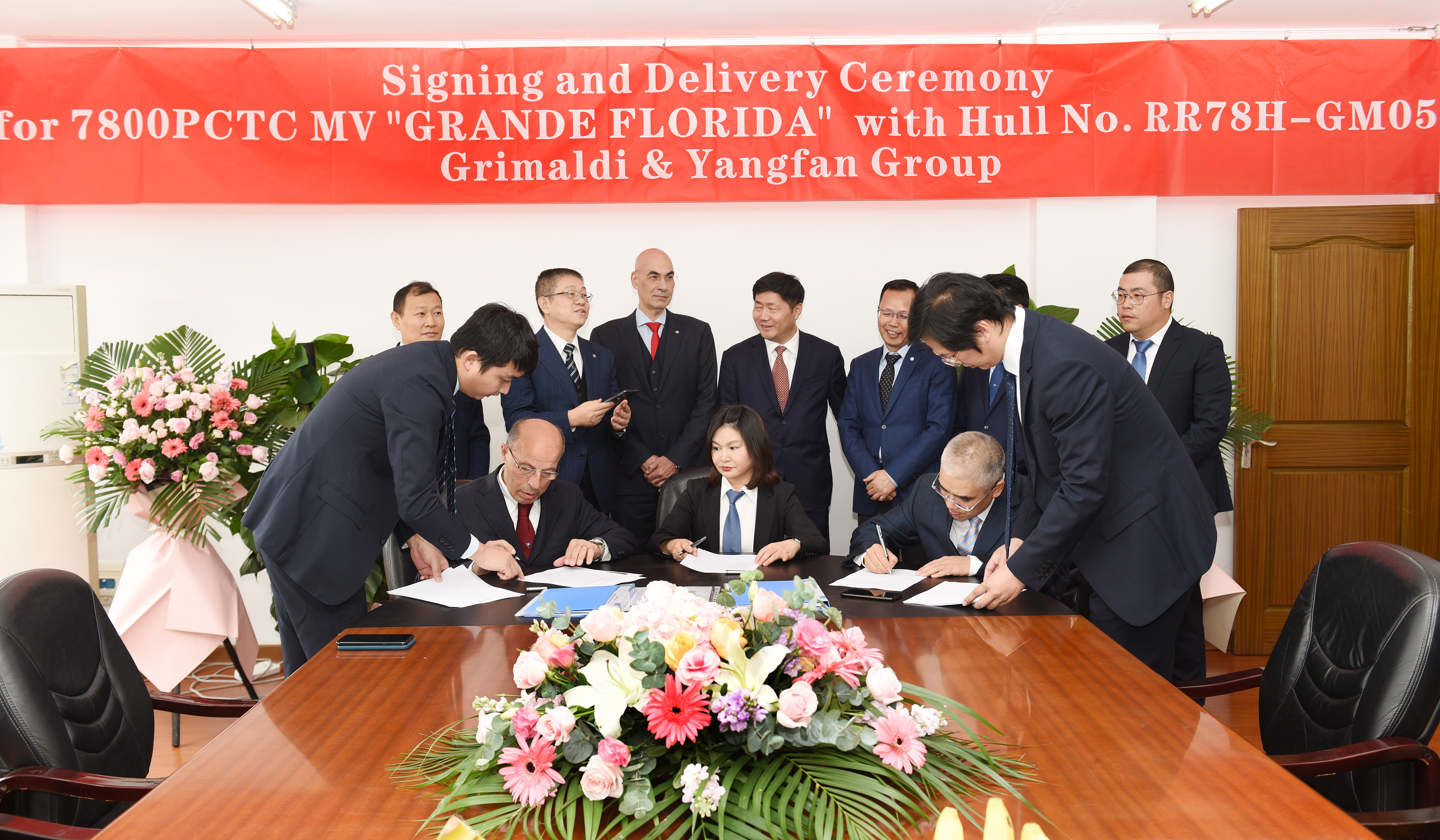 2020年10月19日,由揚帆集團為意大利船東Grimaldi集團公司承建的7800車位汽車滾裝船(PCTC)系列船“GRANDE FLORIDA"”(船號GM05)正式簽字交付。該船距第4艘系列船順利交付僅隔了47天。