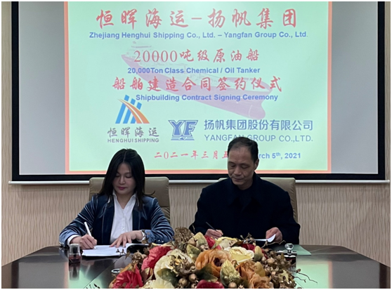2021年3月5日,揚帆集團股份有限公司與浙江恒暉海運有限公司成功簽約1艘20000噸級原油船建造合同。該合同是繼2019年12月30日揚帆集團與恒暉海運簽署1艘18000噸成品油/化學品船建造合同后的第二次成功合作。