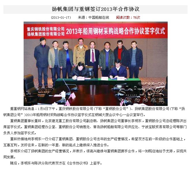中國船舶在線:揚帆集團(tuán)與重鋼簽訂2013年合作協(xié)